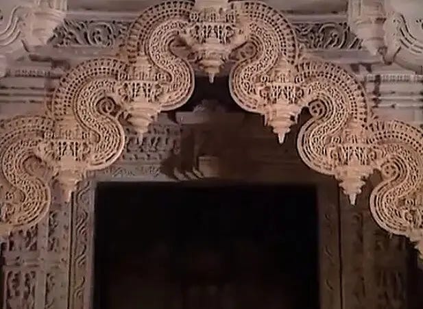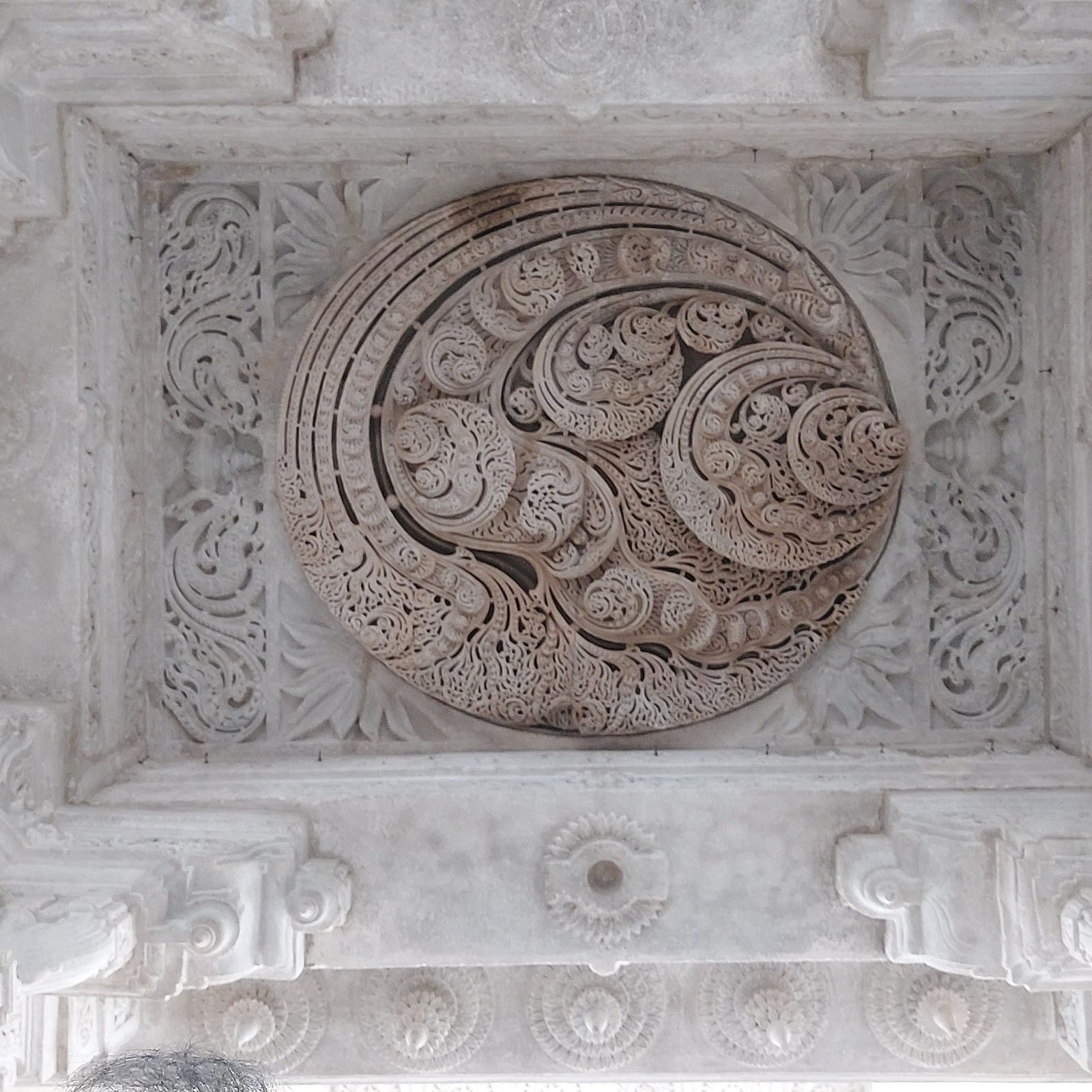 These are highly ornamental decorations carved from single sandstone slabs, there are three of these which adorn the halls of the temple, it is believed that there were originally 108 of them, and the majority of them were destroyed by the marauding forces of Aurangzeb.