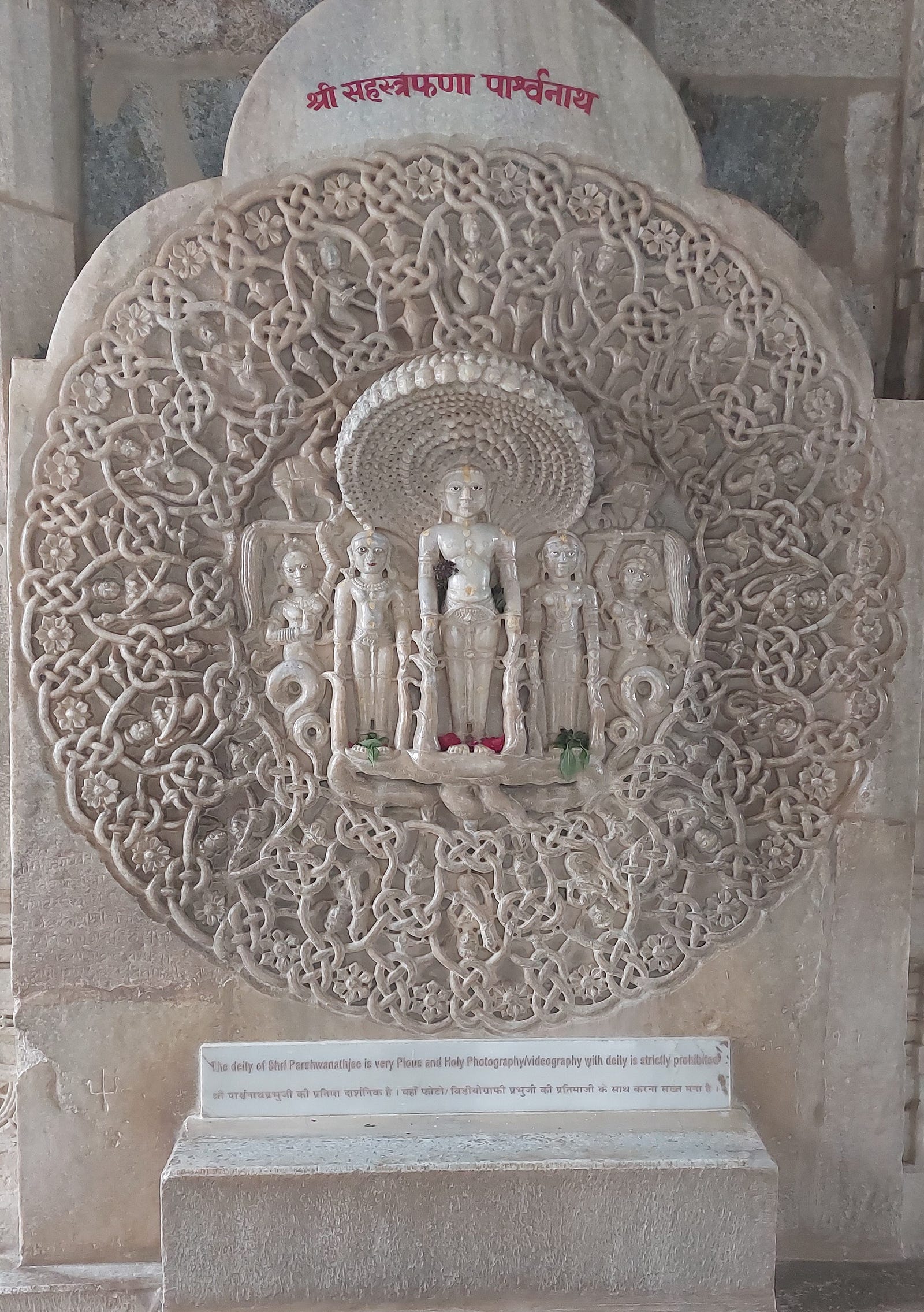 Sahasrafana Parshvanath sculpture, carved from a single block of marble this depicts the 23rd Tirthankara Parshvanath in Kayotsarga pose flanked by the guardian deities Padmavati and Dharnendra, the hood of the 1008- headed mythical serpent Sahasrafana (a cobra with thousand hoods) forms a protective umbrella over Bhagavan Parshvanath, the intertwined tail of the serpent is so intricately carved that it is impossible to trace the end.